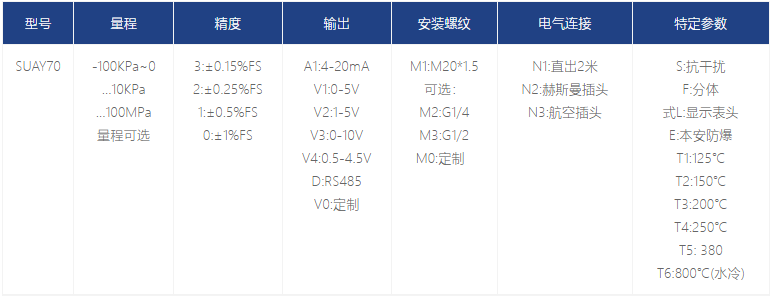 SUAY70 高温压力变送器采用耐高温的硅-蓝宝石技术的感压膜片作为核心,匹配特殊的温度补偿和片上线性修正技术,使其在宽泛的温区内有着良好 的综合性能。蓝宝石材料对温度变化极不敏感,可在-40 至380℃的高温下,也有着ji佳的弹性力敏特性,不会产生疲劳、滞后、PN 节漂移等现象,并且抗辐射性能优异。耐磨损,抗疲劳的钛合金感压膜片,使该系列产品不仅可以承受高温,更兼具良好的耐用性、抗冲击性。利用β相高温力敏材料与合理的结构设计,可将温度扩展至 450-850℃。